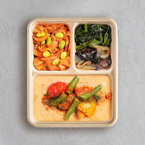 | 原材料名 | 魚介のホワイトカレー(牛乳(国産)、いか、炒玉葱、パプリカ、ムール貝、海老、いんげん、シチュールウ、乳等を主要原料とする食品、無塩バター、発酵調味料、調合油、クミン、洋風魚だし、調味料(粉末)、精製塩、ガラムマサラ、コリアンダーシード、パセリ、パプリカパウダー)、キャベツときのこのアンチョビトマトソース和え(キャベツ(国産)、トマトミックスソース、枝豆、ぶなしめじ、エリンギ、平茸、無塩バター、アンチョビペースト、調合油、精製塩)、ほうれん草のパルメザンチーズ和え(ほうれん草、調合油、パルメザンチーズ、精製塩)、ほのかにハーブ香る茄子のソテー(揚げ茄子、玉葱、調合油、精製塩、ミックススパイス)/加工でん粉、調味料(アミノ酸等)、pH調整剤、酸化防止剤(V.C、V.E)、香辛料、香料、酸味料、乳化剤、(一部にえび・小麦・乳成分・いか・大豆・鶏肉・豚肉・ゼラチン・魚醤パウダー(魚介類)を含む) |