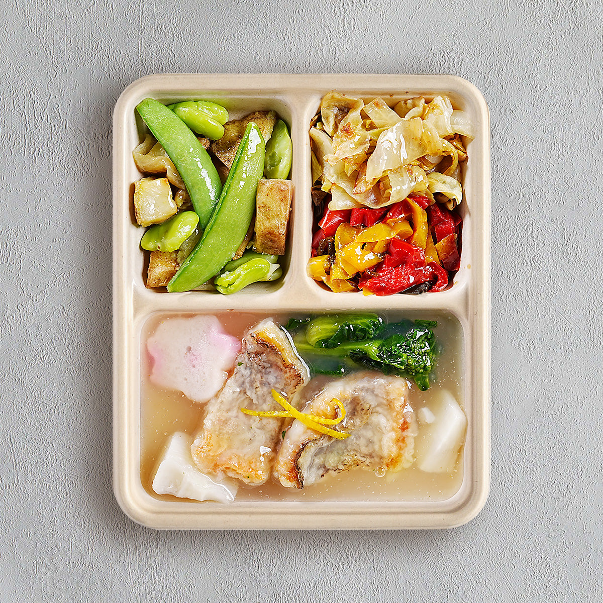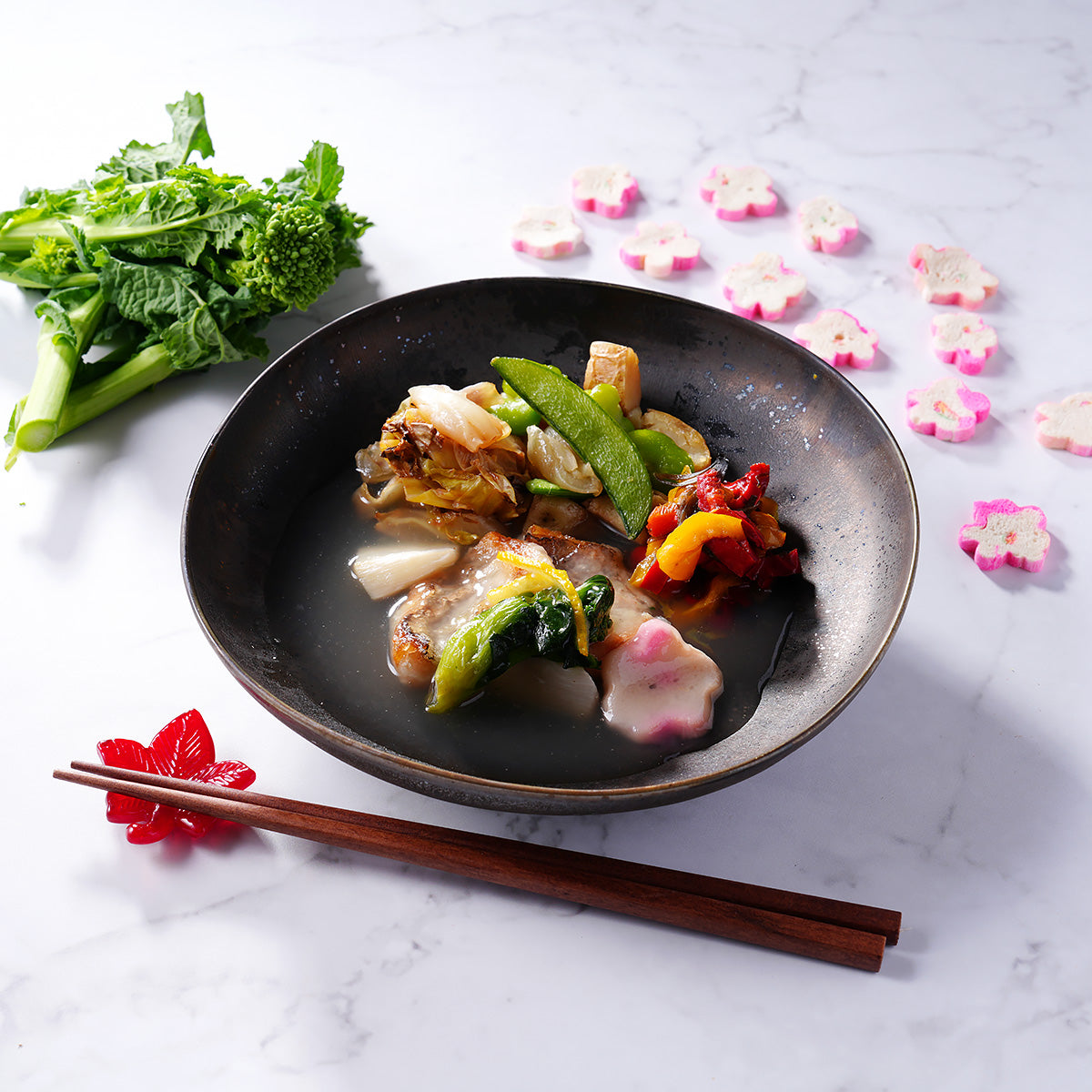 | 原材料名 | 白身魚の揚げ物 はまぐり出汁香るあんかけ仕立て(ホキ(ニュージーランド産)、筍(中国産)、菜の花、はまぐり調味液、花麩、レモン砂糖漬、食用なたね油、昆布茶、食塩、白だしつゆ、醤油、砂糖)、彩り野菜の柚子胡椒和え(玉葱(国産)、じゃがいも、スナップエンドウ、そら豆、食用なたね油、柚子胡椒、醤油、食塩、みりん風調味液、発酵調味料、塩胡椒)、キャベツのおひたし(キャベツ、白だしつゆ、加工酢、かつお削り節)、ピーマンの塩昆布風味(赤ピーマン、黄ピーマン、塩昆布、調合ごま油、食塩)/加工でん粉、増粘剤(加工でん粉、増粘多糖類)、調味料(アミノ酸等)、甘味料(ソルビット、カンゾウ)、酸味料、酸化防止剤(V.E、チャ抽出物、V.C)、乳化剤、着色料(クチナシ青色素、パプリカ色素)、香料、(一部に小麦・ごま・さば・大豆を含む) |